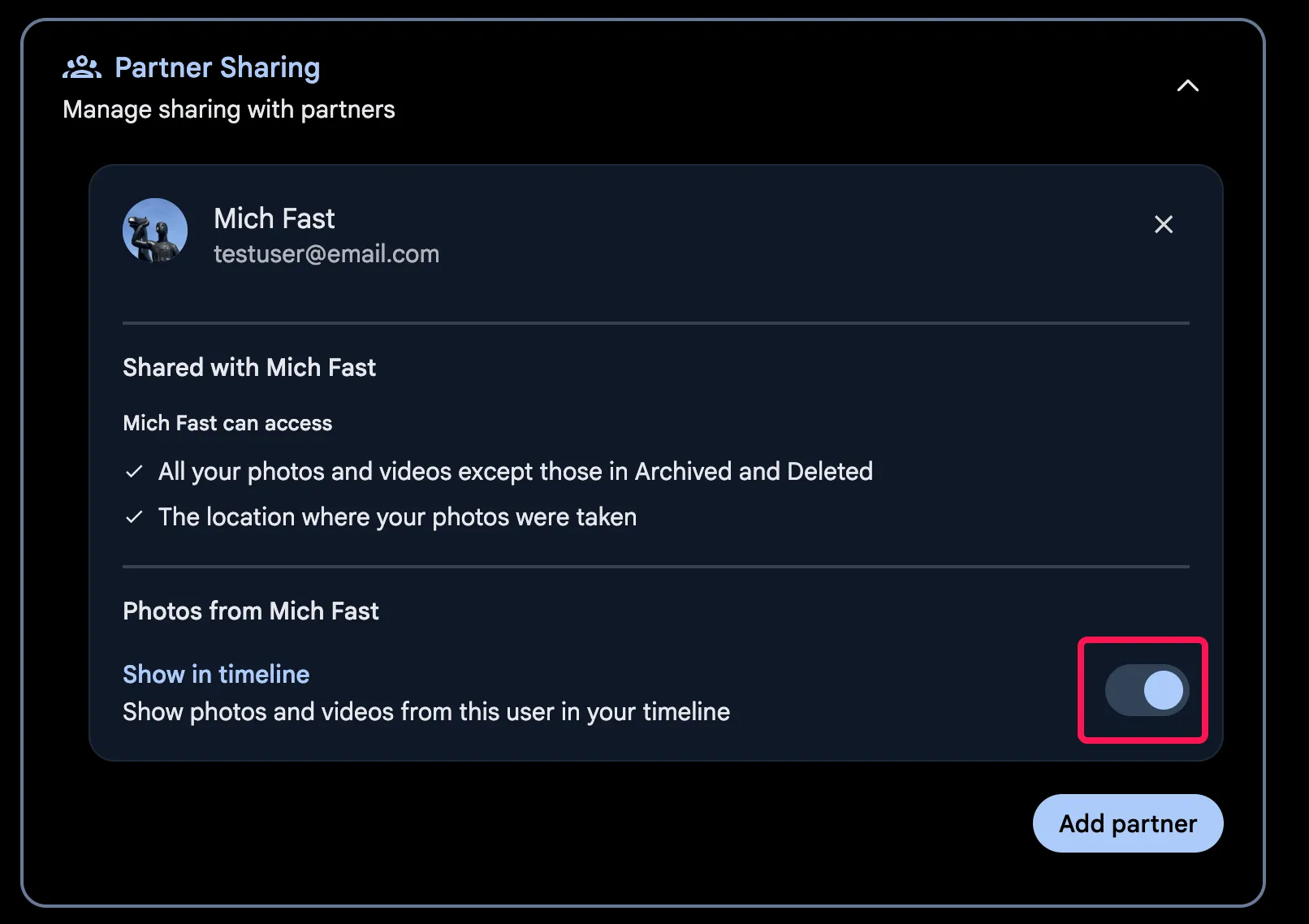 Partner shared photos can be displayed in the main timeline. This feature can be enabled on a per-partner basis and can be viewed and updated on both the web and mobile app.