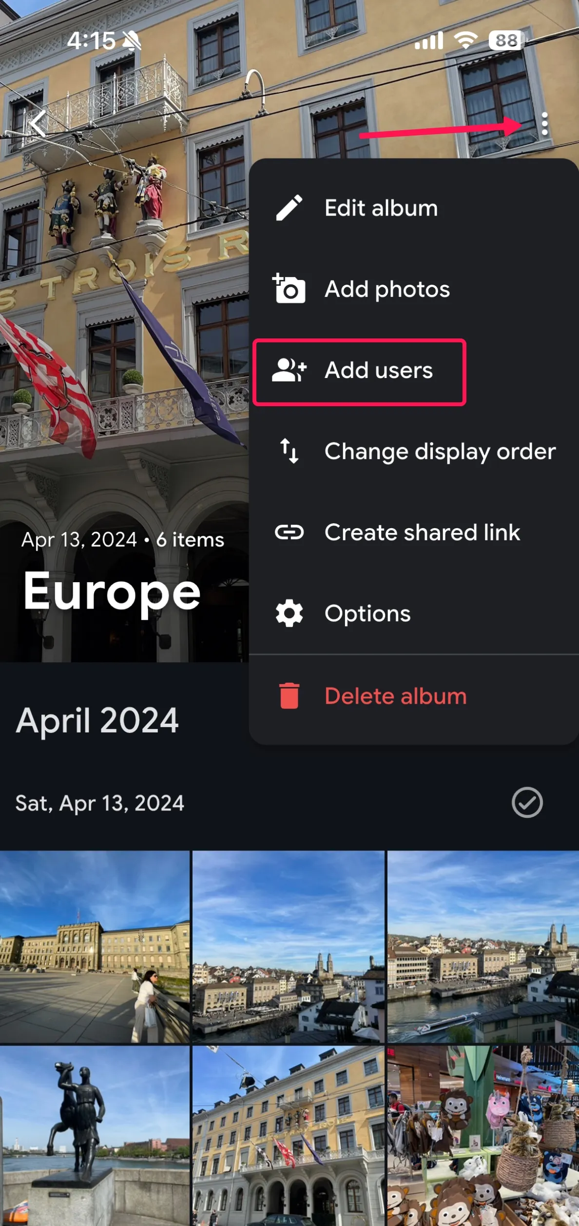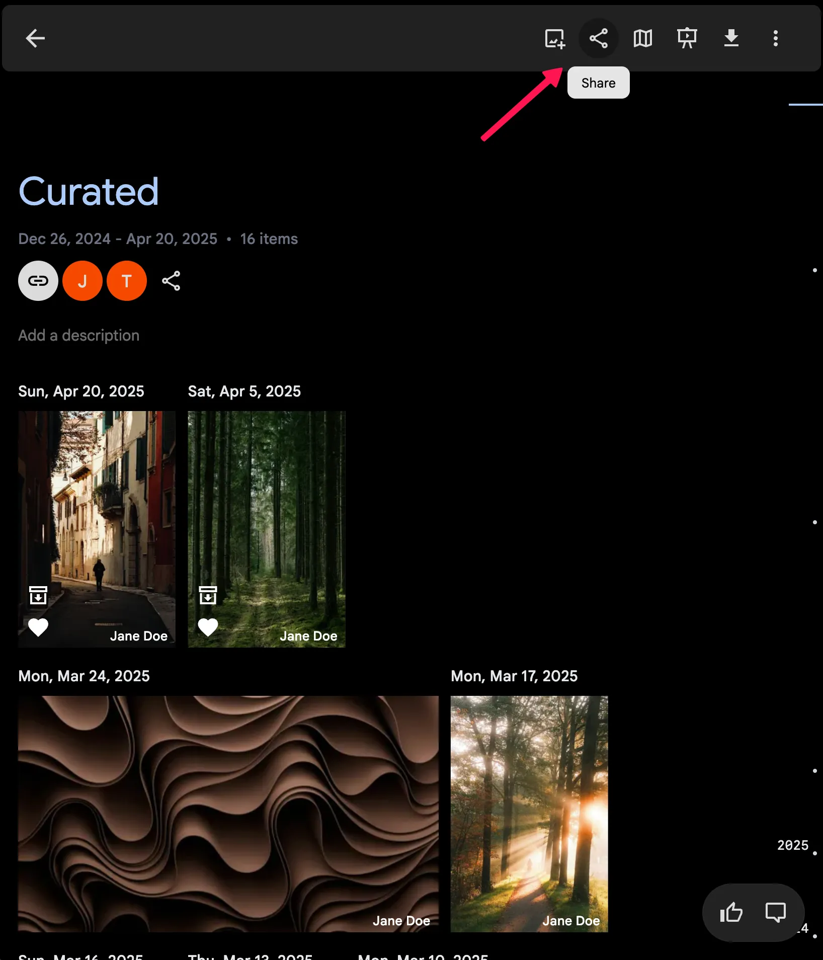 After creating an album, you can access the sharing options by clicking on the share icon. When sharing an album, you can select the users you want to share the album with and assign them permissions either as editors (read-write) or viewers (read-only).